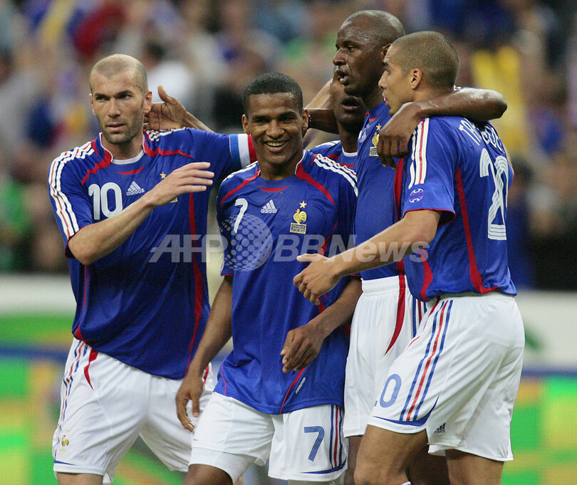 【サンドニ/フランス 27日 AFP】サッカー・親善試合、フランスvsメキシコ。前半45分に先制ゴールを奪ったフランスのフローラン・マルーダ(Florent Malouda、中)はチームメイトのジネディーヌ・ジダン(Zinedine Zidane、左)、パトリック・ビエラ(Patrick Vieira、右2)、ダビド・トレゼゲ(David Trezeguet、右)から祝福を受ける。試合はこれが決勝点となりフランスが1-0でメキシコに勝利した。6月9日に開幕する06サッカーW杯に出場するフランスはグループGでスイス、韓国、トーゴと対戦、グループDに所属するメキシコはイラン、アンゴラ、ポルトガルと対戦する。(c)AFP/PASCAL PAVANI
