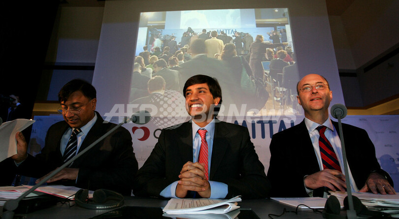 【ルクセンブルク 21日 AFP】鉄鋼大手アルセロール・ミタル(Arcelor Mittal)は21日、2006年の純利益が前年比で4.4%減少したと発表し、2007年第1四半期の利益動向についても慎重な見方を示した。写真は同日、ルクセンブルク(Luxembourg)で記者会見するアルセロール・ミタルのラクシュミ・ミタル(Lakshmi Mittal)CEO(最高経営責任者、左)とAditya MittalCFO(最高財務責任者、中央)ら。(c)AFP/JEAN-CHRISTOPHE VERHAEGEN