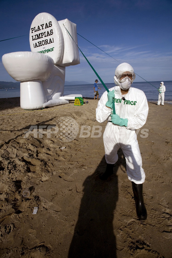 ニュース 環境・科学 メキシコのビーチに巨大トイレが出現 2007年8月2日 6:04 発信地:Vallarta/メキシコ [ 中南米 メキシコ ] このニュースをシェア ‹ › ❮ 1/2 ❯ 2007年8月1日、Los Muertosのビーチに巨大なトイレのオブジェを設置する国際環境保護団体グリーンピース(Greenpeace)の活動家。(c)AFP/GREENPEACE/Gustavo GRAF 画像作成中 ! 【8月2日 AFP】メキシコのVallartaに位置する観光地、Los Muertosのビーチで1日、国際環境保護団体グリーンピース(Greenpeace)の活動家たちが巨大なトイレのオブジェを設置、浜辺の環境汚染を訴えた。トイレのオブジェには「砂浜をきれいに!」と書かれている。(c)AFP 環境・科学 一覧へ> メディア・報道関係・法人の方向け 写真・動画 購入のお問合せ>