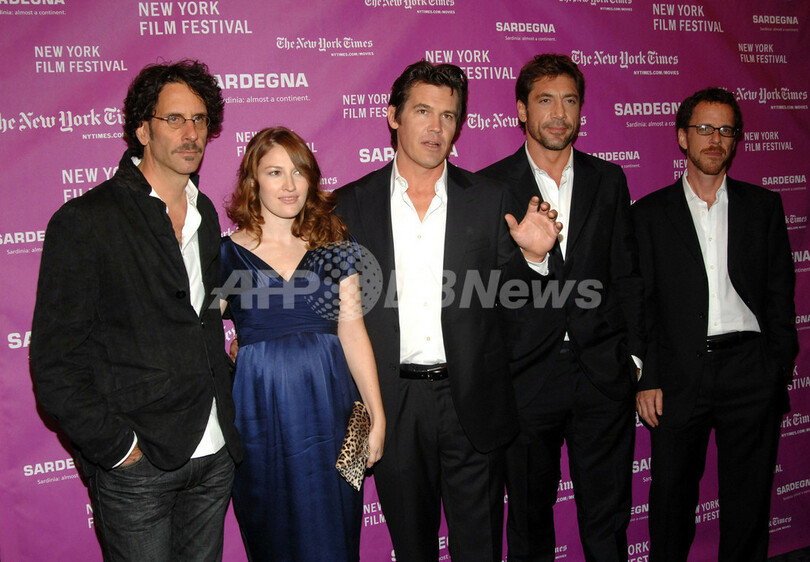 2007年10月6日、第45回ニューヨーク映画祭(The 45th New York Film Festival)で開催された映画『Country For Old Men』の上映会に登場した(左から)ジョエル・コーエン(%%Joel Coen%%)監督、出演女優のケリー・マクドナルド(%%Kelly Macdonald%%)、出演俳優のジョシュ・ブローリン(%%Josh Brolin%%)とハビエル・バルデム(%%Javier Bardem%%)、イーサン・コーエン(%%Ethan Coen%%)監督。(c)AFP/Getty Images Brad Barket