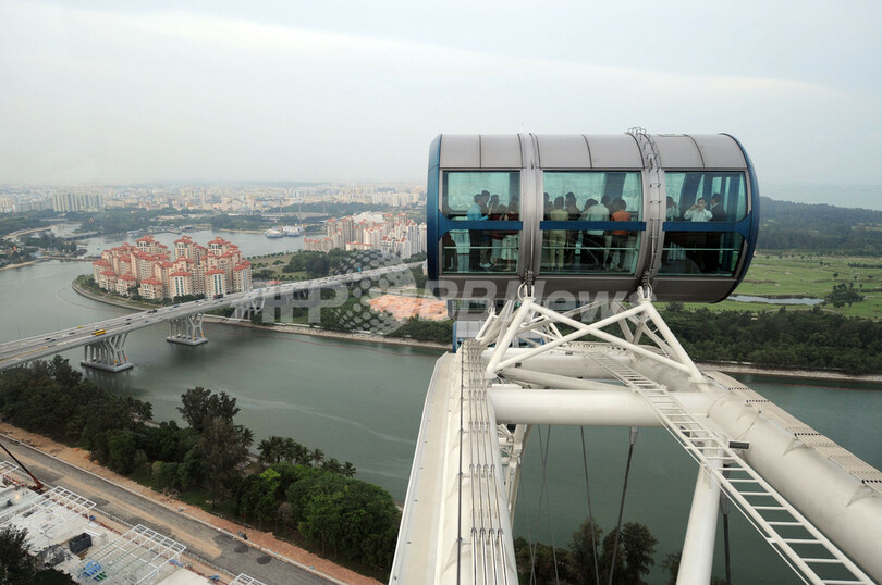 【2月12日 AFP】シンガポールに建設された世界最大の観覧車「シンガポール・フライヤー(Singapore Flyer)」が11日午後6時55分、かすみがかった空の下、運行を開始した。「処女運行」は建設を担当したグレート・ホイール(Great Wheel)の顧客向けで、使用料金は数千ドル。観覧車の高さは英国の「ロンドン・アイ(London Eye)」より30メートル高い、42階建てのビルに相当する165メートル。360度のパノラマからはシンガポール国内だけでなく、隣国のマレーシアやインドネシア領内も見えるという。(c)AFP