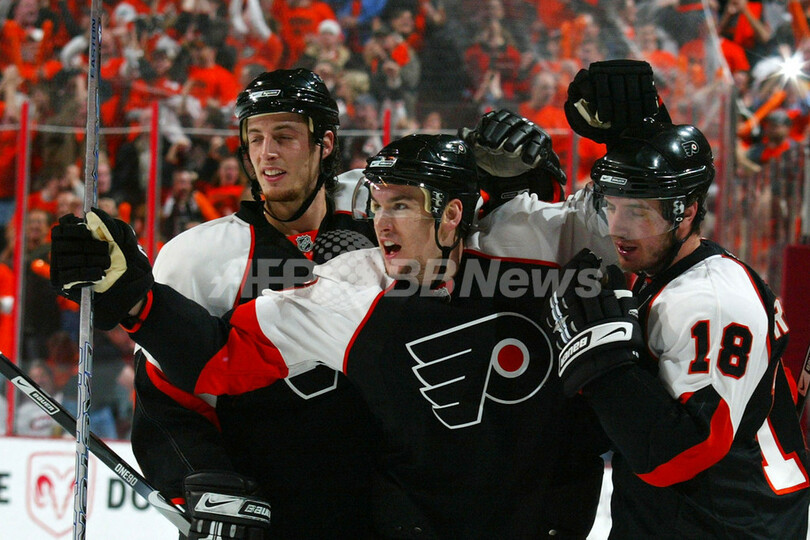 スポーツ ウインタースポーツ フライヤーズ カナディアンズ下し2連勝 2008年4月29日 13:31 発信地:フィラデルフィア/米国 [ 北米 米国 ] このニュースをシェア ‹ › ❮ 1/12 ❯ 第2ピリオドに先制点を決め、ランディ・ジョーンズ(%%Randy Jones%%、左)やマイク・リチャーズ(%%Mike Richards%%、右)から祝福を受けるフライヤーズのフライヤーズのスコッティー・アップシャル(%%Scottie Upshall%%、中央)。(2008年4月28日撮影)(c)AFP/Getty Images/Bruce Bennett 画像作成中 ! 【4月29日 AFP】07-08NHL、東カンファレンス・プレーオフ準決勝・フィラデルフィア・フライヤーズ(Philadelphia Flyers)vsモントリオール・カナディアンズ(Montreal Canadiens)、第3戦。試合はフライヤーズが3-2でカナディアンズに競り勝ち2連勝を飾り、通算成績を2勝1敗とした。(c)AFP/Getty Images ウインタースポーツ 一覧へ> メディア・報道関係・法人の方向け 写真・動画 購入のお問合せ>