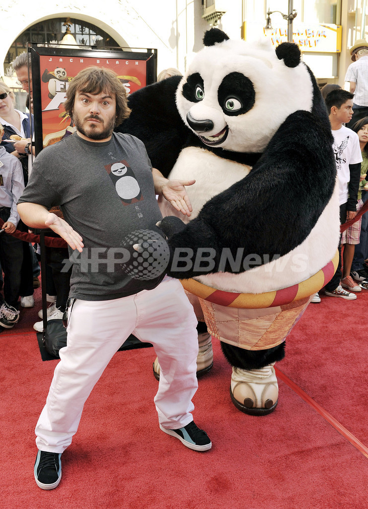 【11月10日 AFP】大ヒットアニメ映画『カンフー・パンダ(Kung Fu Panda)』のDVDリリースを記念したイベントが9日、米カリフォルニア(California)州ロサンゼルス(Los Angeles)で開催された。会場には、主人公のポーとともに、声優として参加した女優アンジェリーナ・ジョリー(Angelina Jolie)、俳優ダスティン・ホフマン(Dustin Hoffman)、ジャック・ブラック(Jack Black)らが登場した。(c)AFP/Getty Images