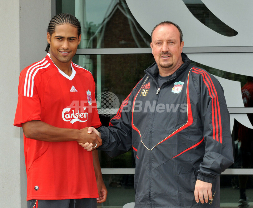 イングランド・プレミアリーグのリバプール(%%Liverpool FC%%)は9日、ポーツマス(%%Portsmouth FC%%)から獲得したイングランド代表のディフェンダー(DF)グレン・ジョンソン(%%Glen Johnson%%)の入団発表をクラブの練習場メルウッド・トレーニング・グラウンド(Melwood Training Ground)で行った。写真はラファエル・ベニテス(%%Rafael Benitez%%)監督と握手を交わすグレン・ジョンソン(左)。(2009年7月9日撮影)(c)AFP/NEIL JONES
