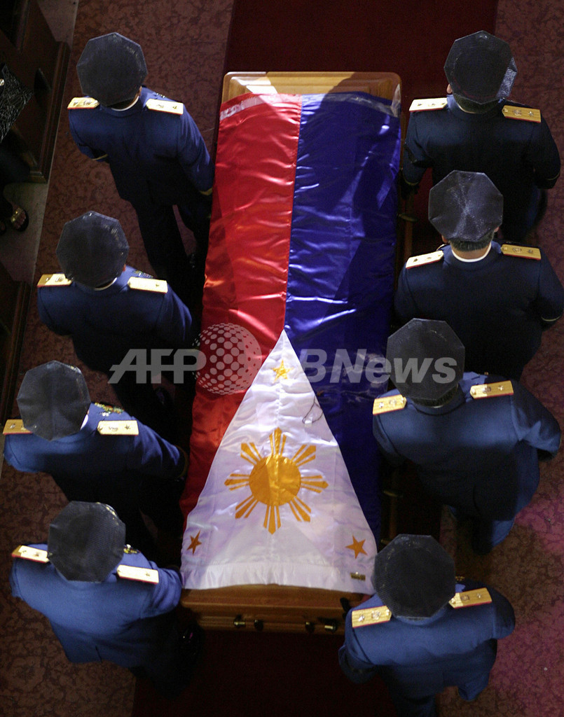 ニュース 政治・経済 マニラ市民、アキノ元比大統領に最後のお別れ 2009年8月4日 13:11 発信地:マニラ/フィリピン [ アジア・オセアニア フィリピン ] このニュースをシェア ‹ › ❮ 1/13 ❯ 1日に死去したフィリピンのコラソン・アキノ(Corazon Aquino)元大統領のひつぎが3日、マニラ(Manila)首都圏内を巡った後、マニラ大聖堂(Manila Cathedral)に安置された。通りを埋め尽くした市民らは、元大統領のシンボルカラーだった黄色の紙ふぶきや花をひつぎに投げかけ、「ピープルパワー」の象徴だった元大統領の死を悼んだ。写真は、マニラ大聖堂に安置されたアキノ氏のひつぎ(2009年8月3日撮影)。(c)AFP/Cheryl Ravelo 画像作成中 ! 【8月4日 AFP】1日に死去したフィリピンのコラソン・アキノ(Corazon Aquino)元大統領のひつぎが3日、マニラ(Manila)首都圏内を巡った後、マニラ大聖堂(Manila Cathedral)に安置された。通りを埋め尽くした市民らは、元大統領のシンボルカラーだった黄色の紙ふぶきや花をひつぎに投げかけ、「ピープルパワー」の象徴だった元大統領の死を悼んだ。(c)AFP 政治・経済 一覧へ> メディア・報道関係・法人の方向け 写真・動画 購入のお問合せ>
