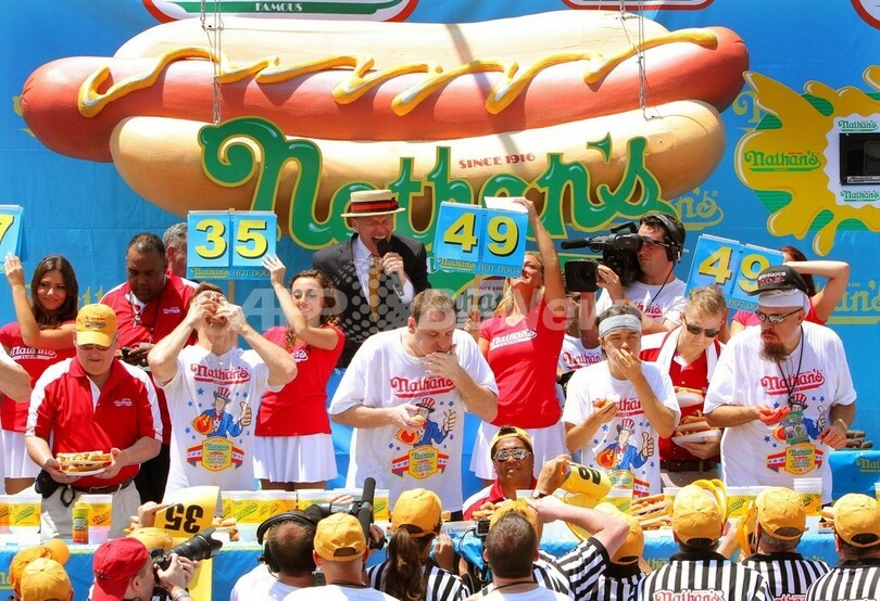 主催者によると、このホットドッグ早食い大会は1916年から行われており、初回の優勝者の記録は13個だったという(2013年7月4日撮影)。(c)AFP/Getty Images/Monika Graff